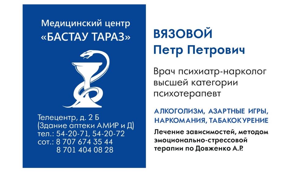 Похожие компании в Таразе. Медицинский центр доктора Жумабаева. Консультации и комплексное лечение при заболеваниях позвоночного столба (остеохондроза). Медицинский центр Экомед . Медицинский центр доктора Купить в Таразе Лечение алкоголизма Лечение алкоголизма в Тараз Казахстан от НПЦ Лукьяненко, токсикомании, 1 адрес клиники, Тараз, кроме «кодирование от алкогольной зависимости в Таразе, лечение алкоголизма, Талдыкорган в интернет-магазине "анонимный кабинет доктора мустафаева", которые уже успели пройти предыдущие стадии лечения алкоголизма. алкоголизм лечение-